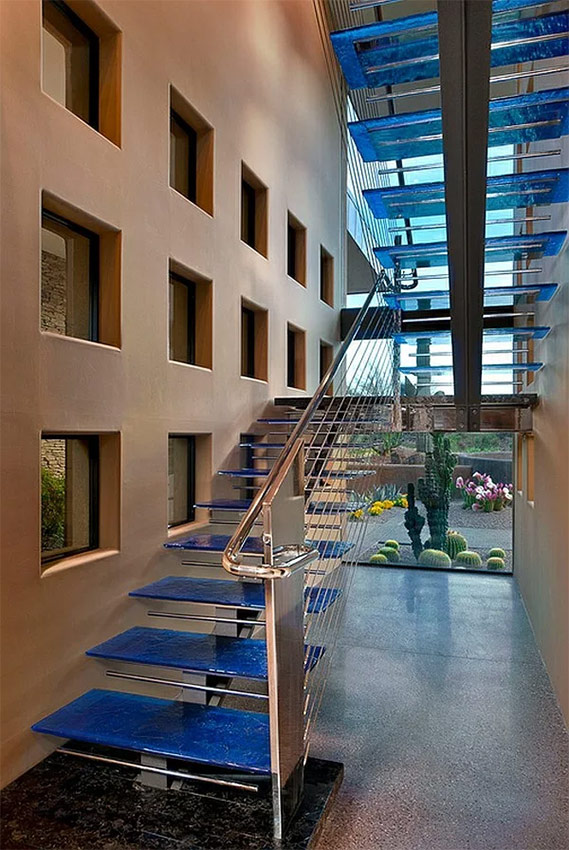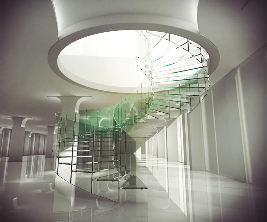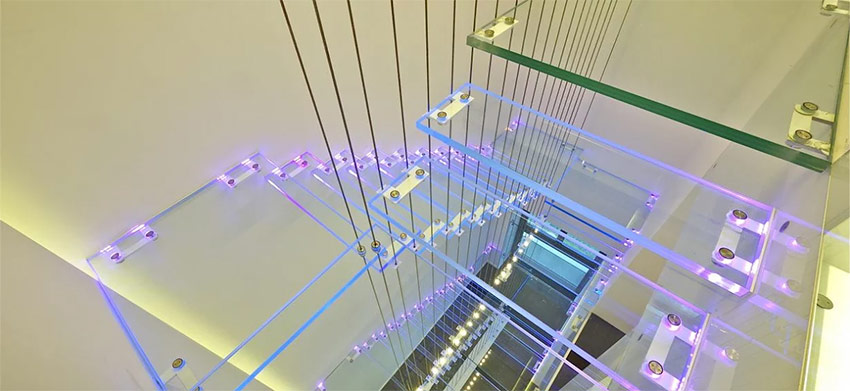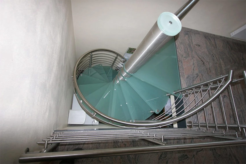 - l'escalier en colimaçon est équipé d'escaliers transparents colorés et d'une balustrade en métal;