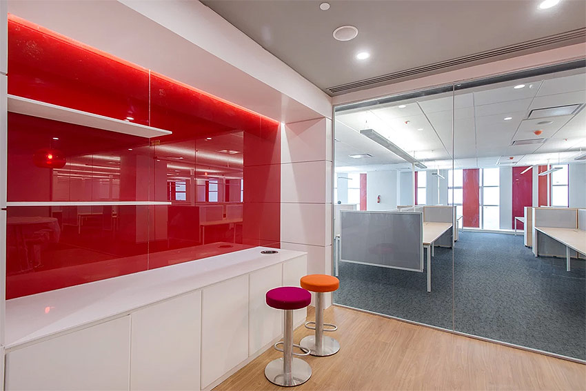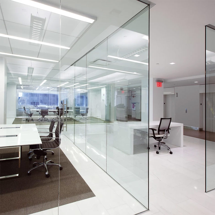 Les cloisons transparentes sont recherchées pour les espaces de bureau de zonage Cette idée a d'abord été utilisée par les designers américains. Ils ont nettoyé les murs de tout le plancher de production, ne laissant que des éléments de support. Ils ont utilisé la lumière d’un mur équipé de fenêtres pour éclairer l’ensemble du bureau sans l’interrompre avec une cloison dense, mais en le séparant par des structures de verre transparentes. Ainsi, chaque employé a reçu un espace de travail personnel, mais a néanmoins le sentiment de faire partie d’une seule équipe.