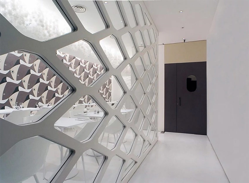 Remplissant un intérieur classique solide de constructions et de détails en verre, le concepteur le rend plus léger, plus élégant. Dans le même temps, les comptoirs en verre ornent uniquement les tables massives aux pieds sculptés et les lustres en cristal luxueux créent une atmosphère de fête.