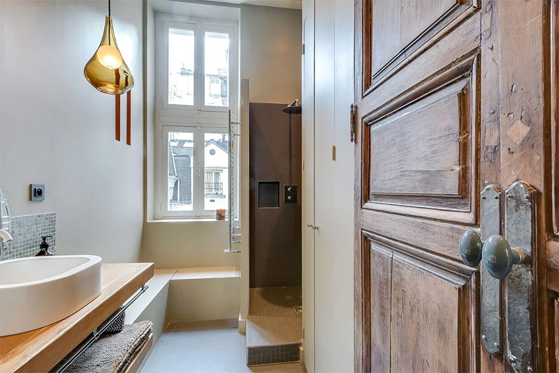 Vieilles portes en bois complétant les nouveaux appareils sanitaires.