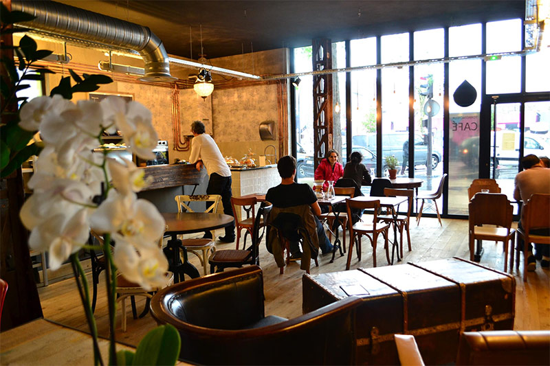 Café parisien charmant avec une atmosphère ancienne et confortable.