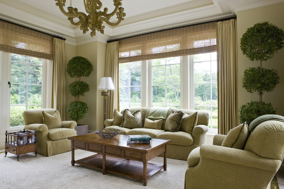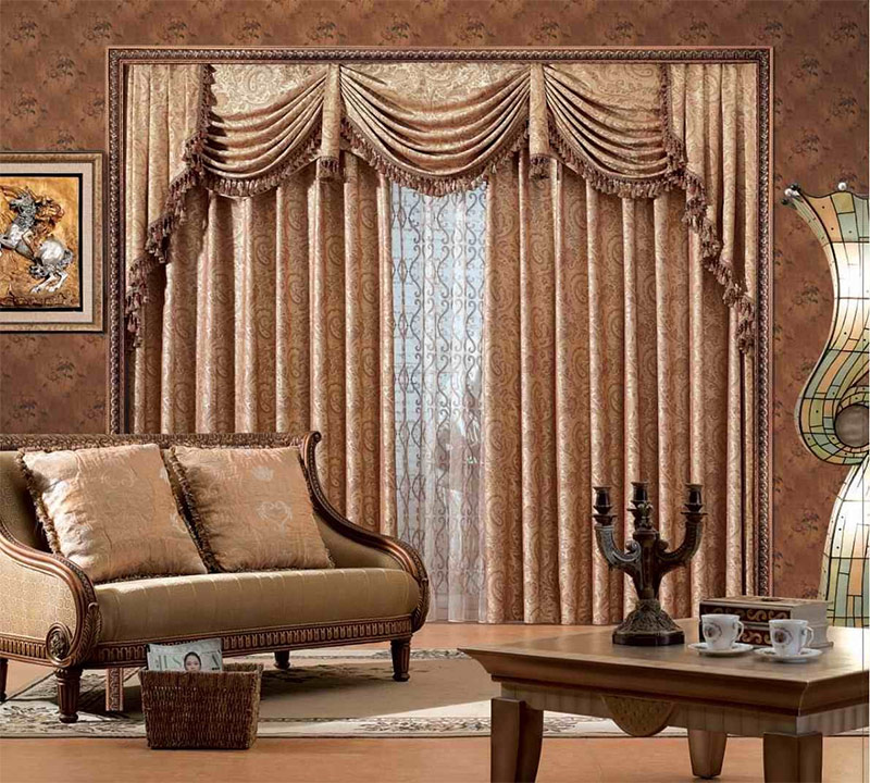 Pour les intérieurs classiques et néoclassiques, les rideaux sont choisis parmi un tissu de rideau dense, complété par des décorations sous la forme de micros, de franges, de suspensions. Souvent, les rideaux de style classique sont réalisés sous la forme d’un lambrequin, combinant des tissus de plusieurs couleurs.