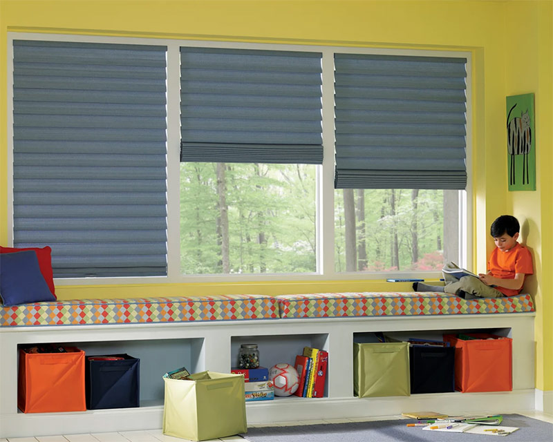 Pour réduire visuellement la surface de la fenêtre, des couleurs vives et des rideaux sont utilisés dans la forme de la fenêtre. Il peut s'agir de stores, de stores romains, de stores à rouleau ou de rideaux courts.