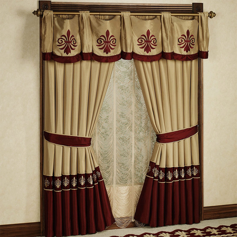 Lorsque l'aménagement intérieur vient d'être planifié, les rideaux sont sélectionnés pour correspondre au reste des textiles, puis la gamme de couleurs de la pièce est ajustée en conséquence. Par exemple, les rideaux beiges et bordeaux complètent le tapis de la même couleur.