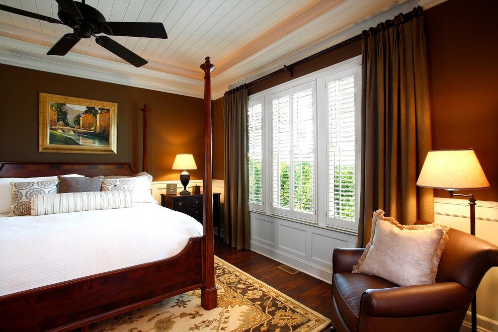 La combinaison de couleurs des rideaux et du papier peint à l'intérieur convient à la décoration de petites pièces, puisque les murs se confondent avec la fenêtre en une seule ligne, l'espace n'est pas divisé en plusieurs parties. En outre, le schéma de sélection des rideaux pour la couleur des murs est considéré comme le plus sûr - il n’ya aucune chance de se tromper et de choisir la mauvaise couleur. Peu importe la couleur du sol, du plafond ou des meubles. Si les murs et les rideaux sont en harmonie, c'est une option gagnante. Vous pouvez jouer avec les nuances et choisir des rideaux marron clair pour le papier peint marron. A propos, ils peuvent être avec un motif, une broderie, un motif ou un relief. Cette option sera élégante.