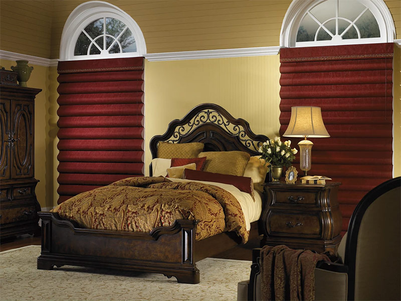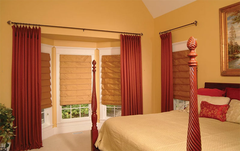 Draperies romaines classiques en coton dans la chambre à coucher.