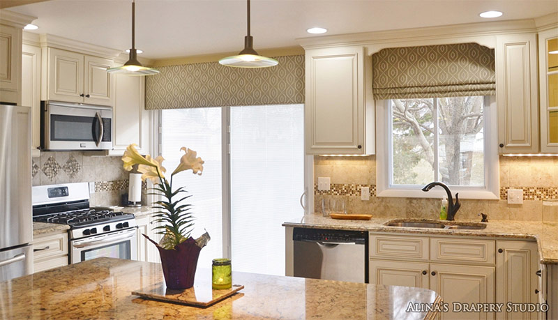 Rideaux sur les portes et les fenêtres de la cuisine.