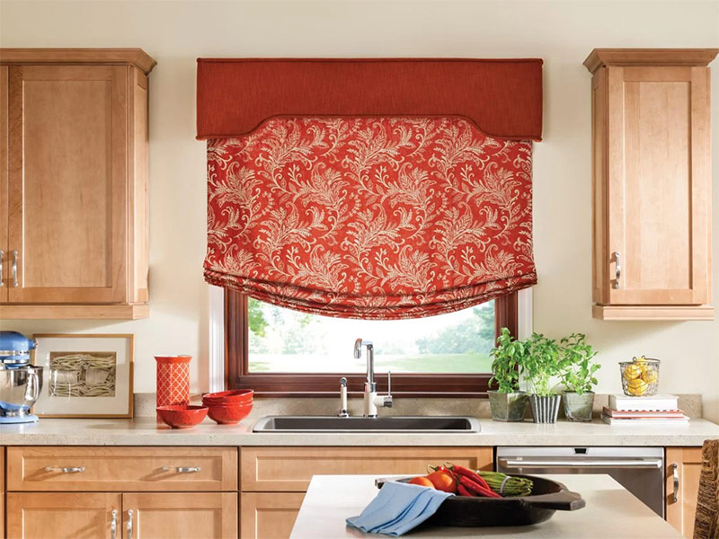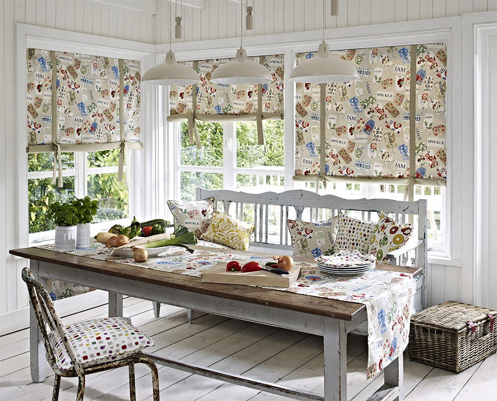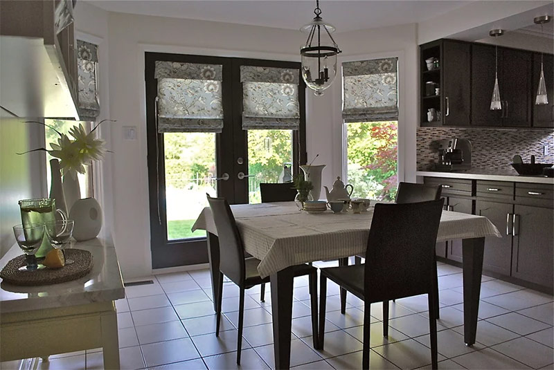 Les conditions de l’espace de cuisine dans un appartement et une maison peuvent être différentes: grand et petit espace, aménagement commode ou forcé de meubles, hauts et bas plafonds. Malgré cela, les rideaux courts iront dans toutes les cuisines. Les rideaux romains à l’intérieur de la cuisine ne prennent pas d’espace inutile, ne créent pas de gêne et suffisent pour les lever pendant la cuisson ou la vaisselle afin qu’ils restent propres plus longtemps.