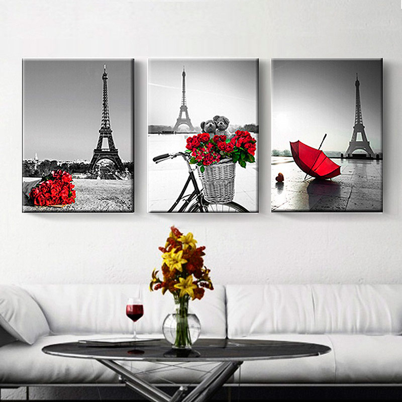 Triptyque noir et blanc «Memories of Paris» avec un accent rouge.