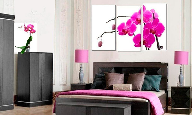 Les fleurs, les animaux et les paysages naturels constituent le thème le plus populaire à l’intérieur des chambres. Les peintures modulaires à l'intérieur de la chambre ne doivent pas être trop lumineuses. Une solution élégante consiste en des modules noir et blanc avec un accent brillant ou sans.