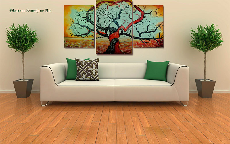 Triptyque composé de trois modules. En fonction de la taille des modules et de la méthode utilisée pour les positionner, l'image peut être adaptée à la décoration d'une chambre à coucher, d'un couloir ou d'une autre pièce de taille moyenne.
