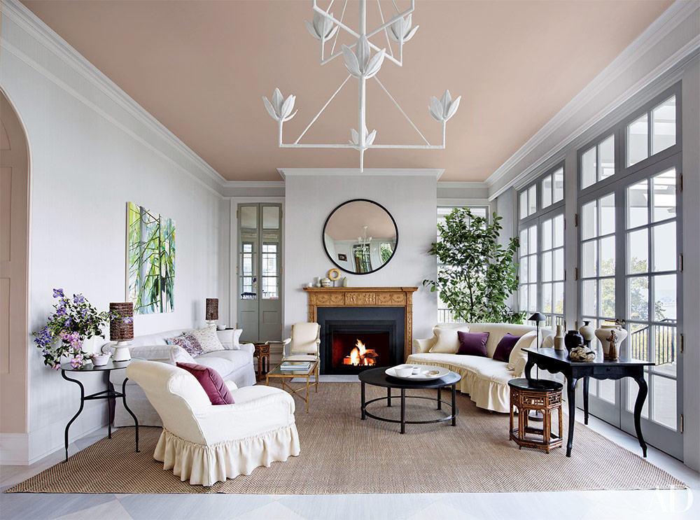 Le plafond rose pâle, la couleur du plâtre qui s'installe, donne une lueur rougeâtre au salon conçu par Jeffrey Bilhuber. Cheminée de cheminée écossaise du XVIIIe siècle, table basse ronde Lucca Antiques, fauteuils et canapés sur mesure, lustre Démiurge New York, peinture de Claire Sherman, miroir de Lucca & Co. et le tapis de la collection de Mitchell Denburg, en se combinant, créent un style d'espace.