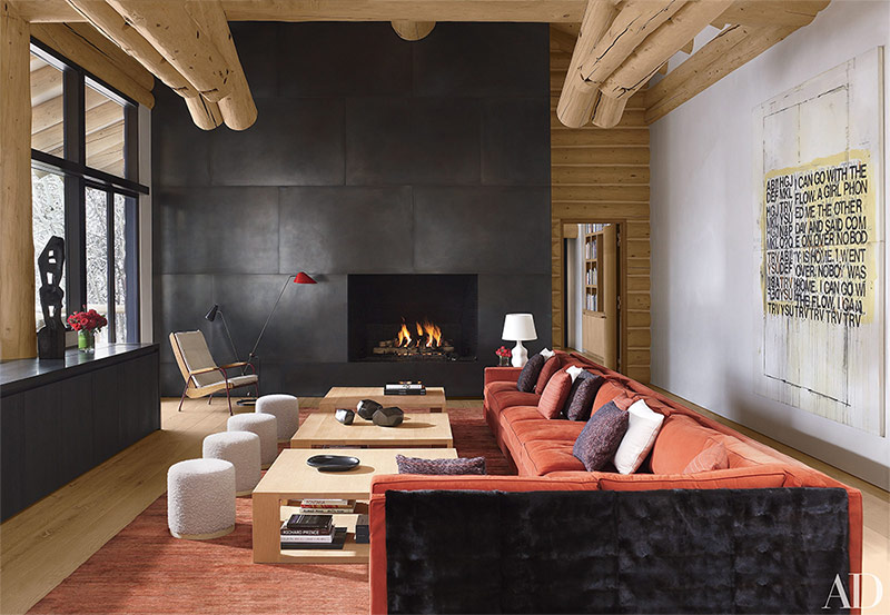 Le salon d'une maison à Aspen, dans le Colorado, a été reconstruit par Atelier AM. La place centrale ici est sans aucun doute une cheminée, les murs autour desquels sont garnis d'acier noir. En outre, les visiteurs de ce salon peuvent voir un canapé sectionnel personnalisé recouvert de tissu Loro Piana, des tabourets ronds Atelier AM, une chaise Prouvé vintage, un lampadaire Pierre Guariche et un tableau de Richard Prince.