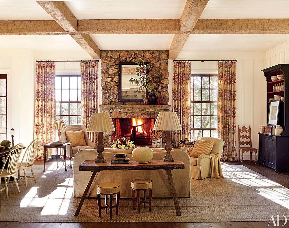 La décoratrice de la maison Susanne Kasler et les employés du cabinet d'architecture Spitzmiller & Norris ont conçu le salon avec cheminée de cette maison. La beauté de la pièce est soulignée par des poutres en bois de cyprès blanchi et une cheminée en pierre locale. La conception de la chaise que vous voyez à droite a été conçue par Susanne Kasler pour la chaise Hickory, la penderie ancienne peinte est de Ainsworth-Noah et les rideaux sont cousus à partir du tissu de Robert Kim.