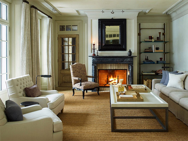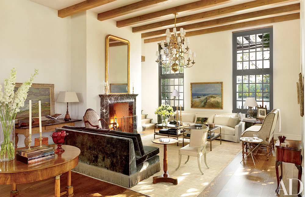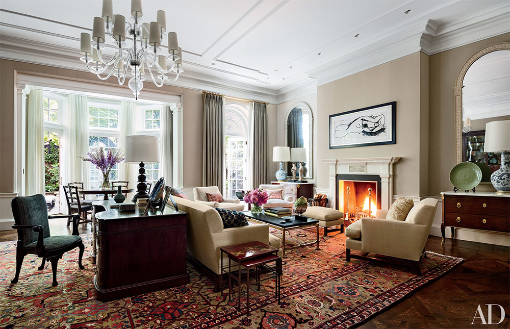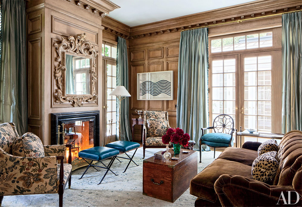 Salon avec cheminée. Le travail du designer Jeffrey Bilhuber.