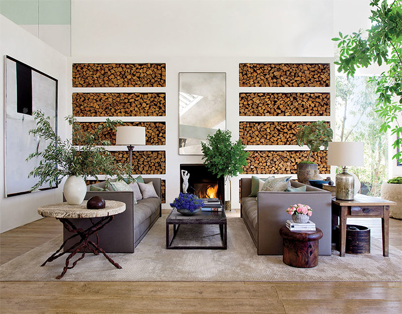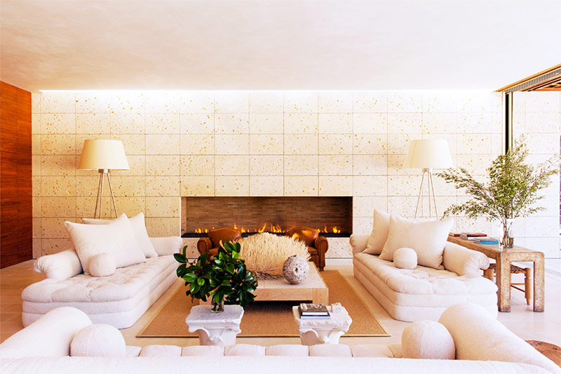 Dans le salon de cette maison californienne, créée par les spécialistes de Backen, Gillam & Kroeger Architects et April Powers, le mur de la cheminée est tapissé de coquilles du Texas. Canapés Vintage - de Michael Taylor, lampadaires - œuvres de Shakib Richani.