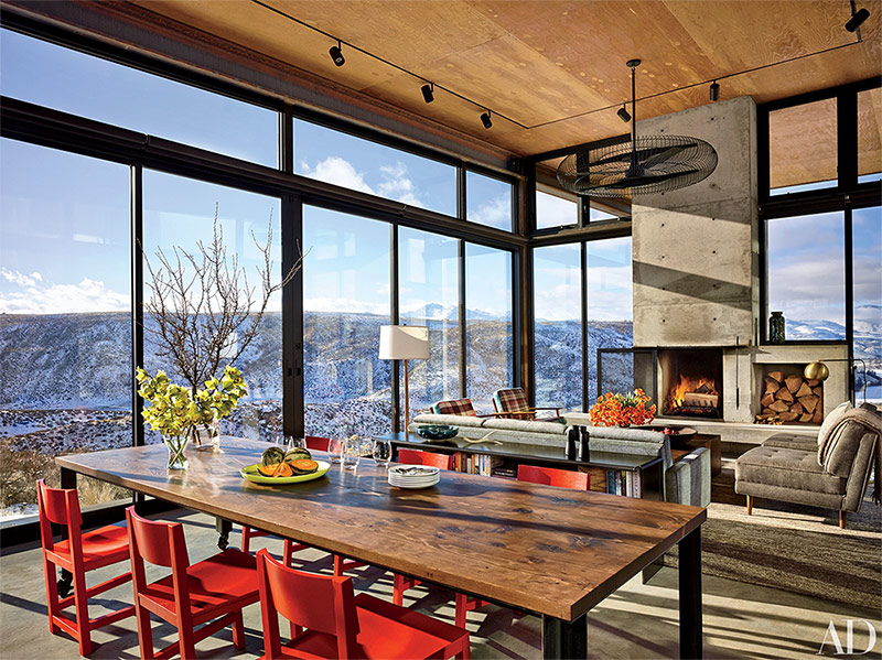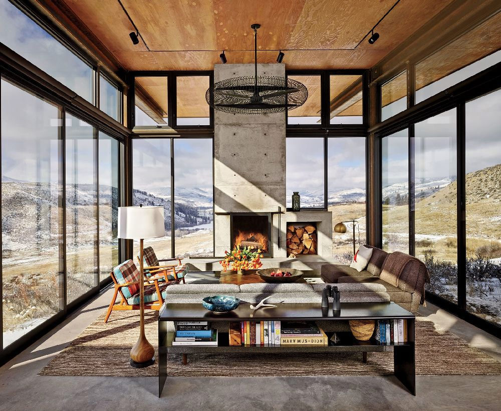 Pour le salon de cette maison située dans les montagnes au nord-est de Seattle, les concepteurs d’Olson Kundig Architects ont conçu un écran de cheminée spécial.Le ventilateur de plafond provient de Northwest Envirofan et les chaises de restaurant proviennent de Moooi.