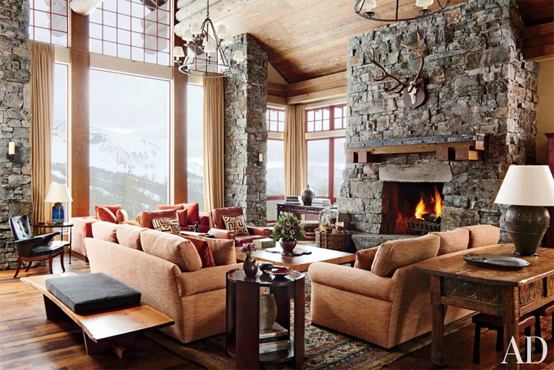 La cheminée, revêtue de pierres recouvertes de mousse, définit le style du salon de cette maison du Montana, construite par des architectes de Locati Architects et décorée par Michael S. Smith. La table ronde au premier plan est de Jasper, ainsi que le tissu recouvrant les canapés créés par Michael S. Smith. Lustres en fer - de Formations. Le fauteuil en cuir noir datant d’environ 1930 provient de Fritz Henningsen et le banc est l’œuvre de George Nakashim.