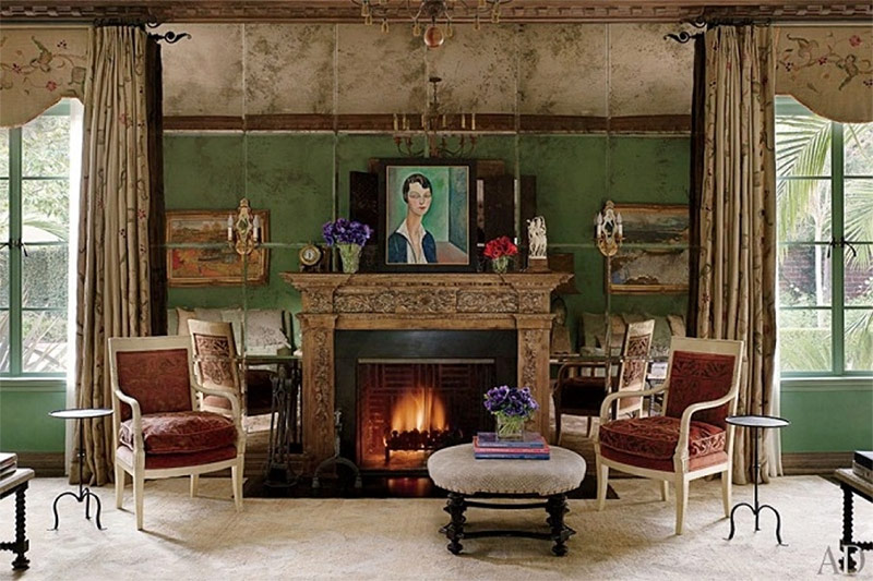 Des panneaux en miroir vieillis artificiellement entourent une cheminée dans le salon d'une maison de 1935 à Los Angeles, restaurée par Pamela Shamshiri de Commune, une entreprise de décoration d'intérieur. Une image du réalisateur Jean Negulesco est suspendue au-dessus de la cheminée. Attirer l'attention sur les tables en fer - de Holly Hunt.