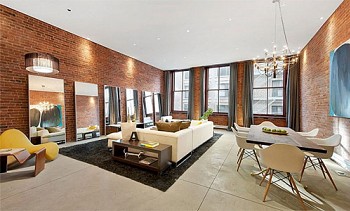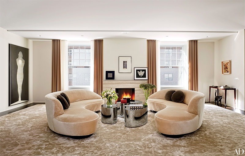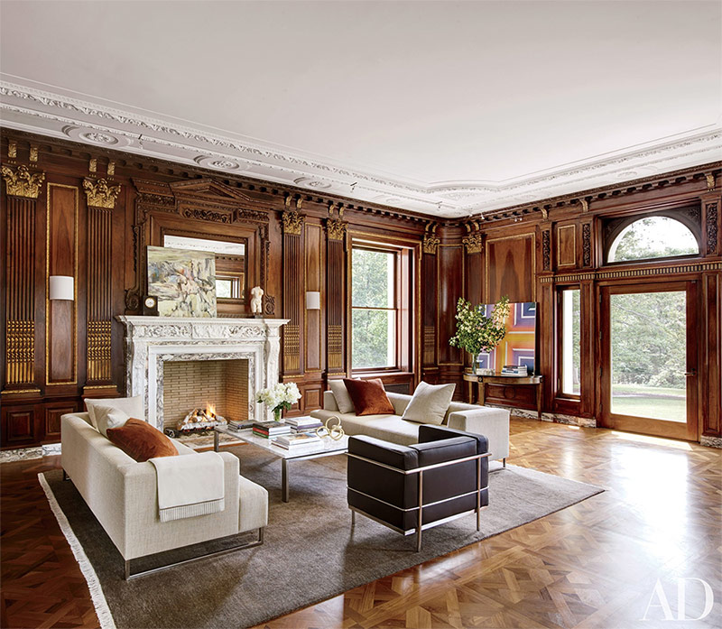 Dans le salon de la maison de ville de Manhattan, reconstruit par Brian Sawyer et John Berson, miroirs français néoclassiques de H.M. Luther est encadré par un dessin de Picasso et une cheminée de designer. Un canapé fait sur mesure et des fauteuils moelleux recouverts de soie reposent sur un vieux tapis persan, tandis que les murs sont recouverts de velours.