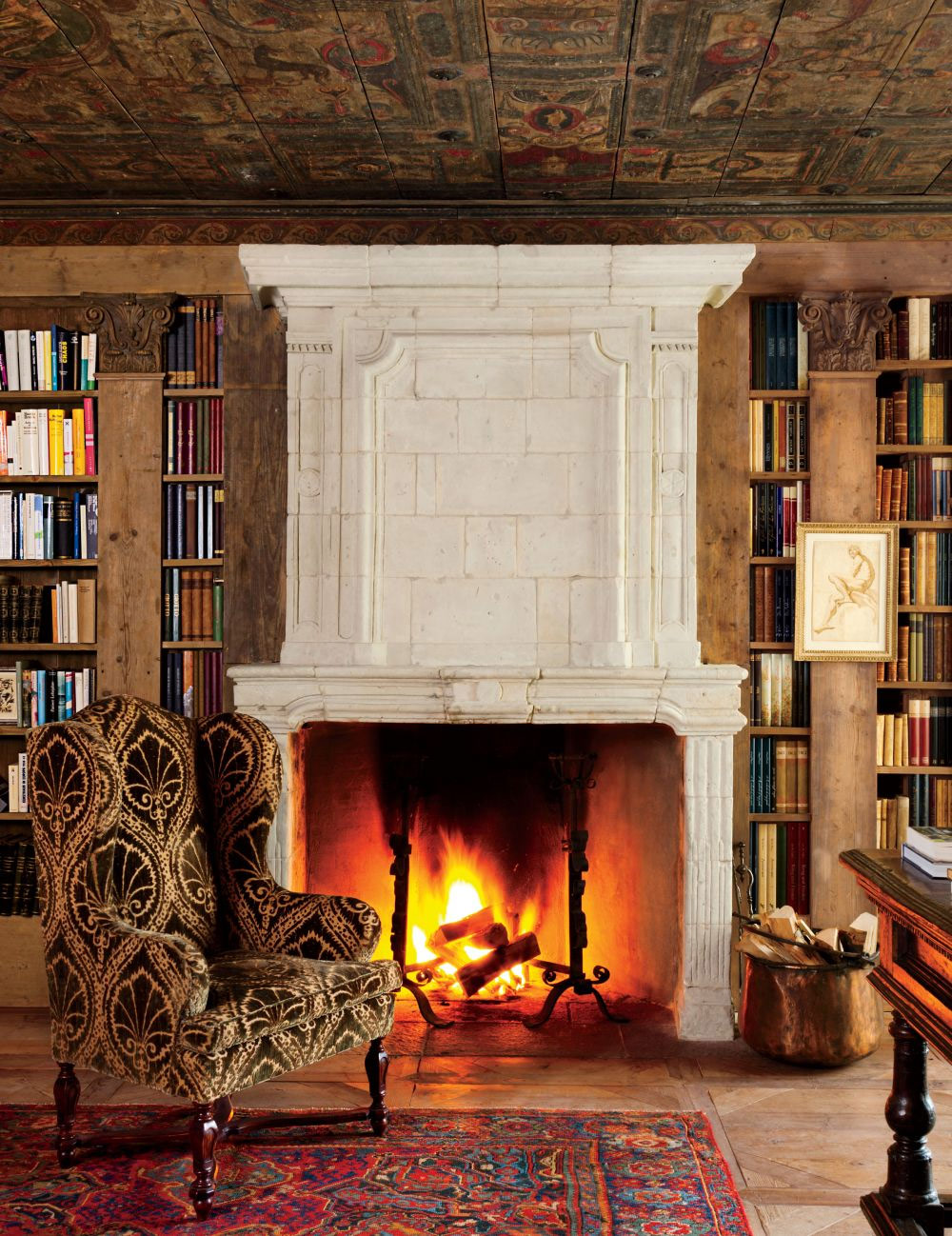 Dans le salon-bibliothèque de la maison des Alpes suisses conçue par Studio Peregalli, un fauteuil à garniture de velours s'est «installé» près de la cheminée française du XVIIe siècle.