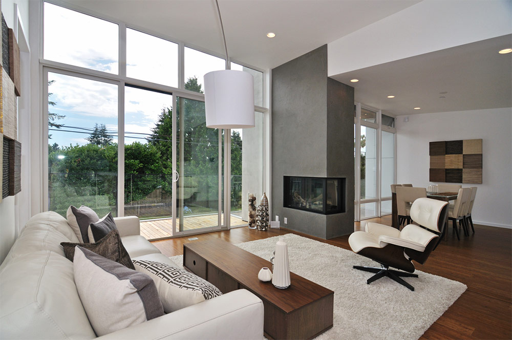 L'atmosphère du salon de cette maison à Vancouver est sans aucun doute créée par une cheminée d'angle moderne (de Chris Pardo Design | Elemental Architecture).