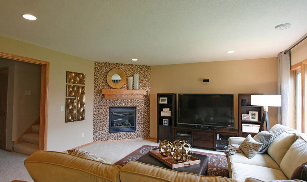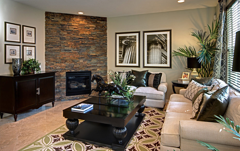 Salon moderne avec cheminée en pierre et simple cheminée (de Cedarglen Homes).