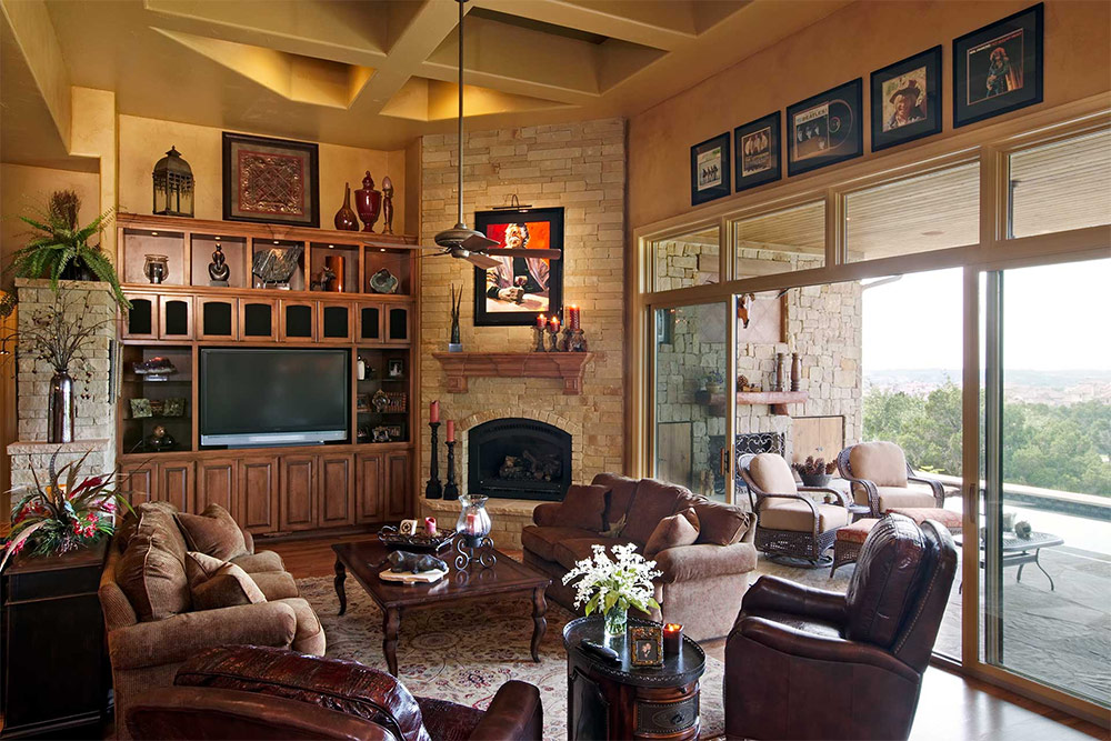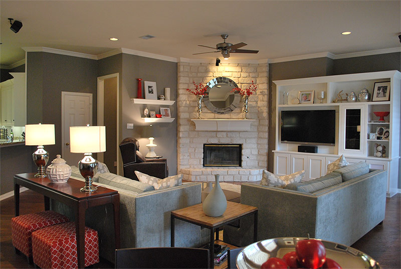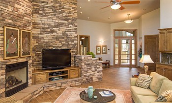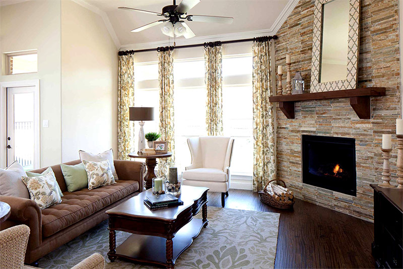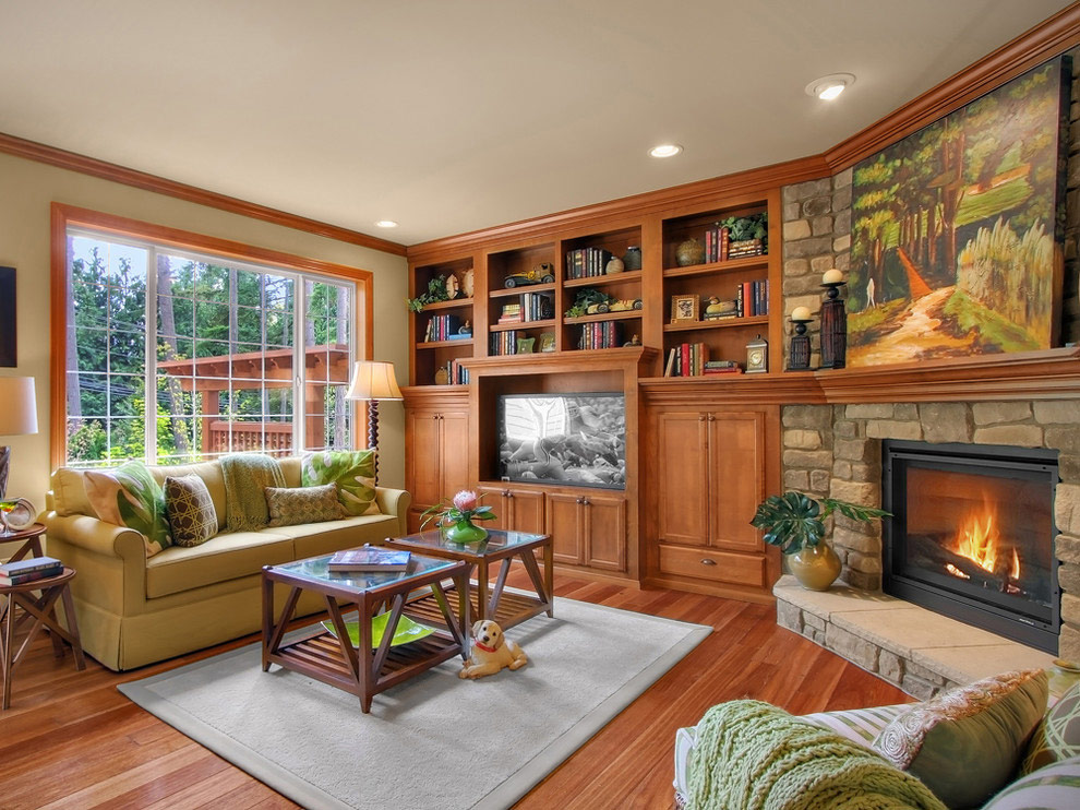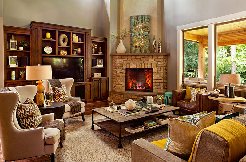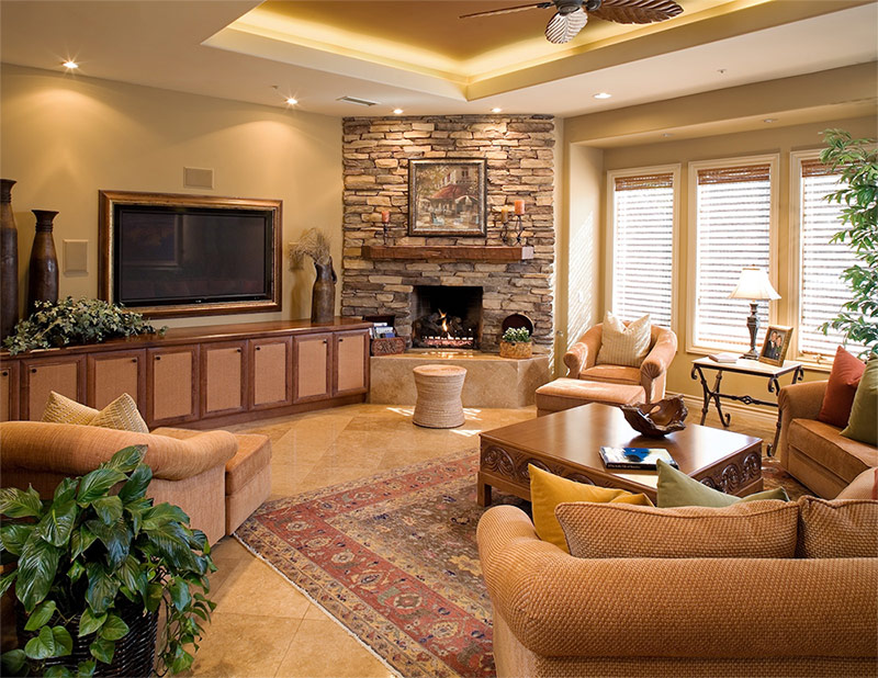 La couleur sable des murs de ce salon s'harmonise bien avec la couleur du bois naturel à partir duquel les armoires sont fabriquées et avec la couleur des pierres avec lesquelles le mur de la cheminée est fini (de John Buchan Homes).