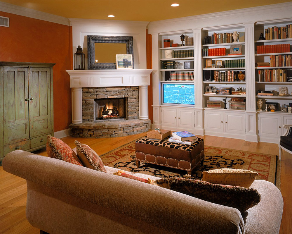 Cette cheminée d'angle entourée de bibliothèques rivalise d'attention avec une grande télévision à écran plat. Mais comme la cheminée se dresse sur un piédestal et sert de support à un beau panneau de miroir, une victoire est à chaque fois remportée par lui (de Dan Waibel | Designer & Builder).