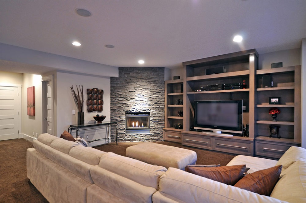 Lorsque les propriétaires et les invités de ce salon ne regardent pas la télévision avec un écran plasma de 60 pouces, leur attention est concentrée sur une cheminée en pierre (de James Patrick Walters Design).