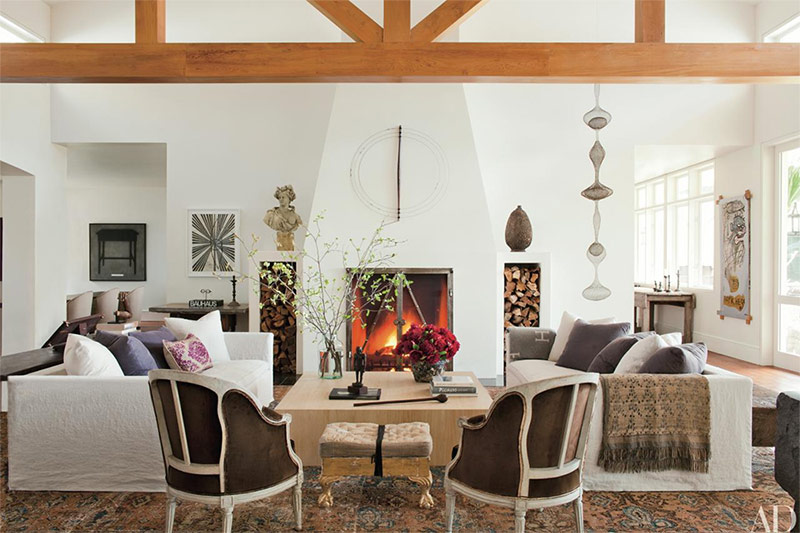Le concept d'aménagement d'un salon dans une maison californienne a été développé par Miles Redd. Les murs sont finis en chêne blanc, devant la cheminée sont des tabourets en cuir de Moore & Giles, les portes françaises sont à moitié recouvertes de textiles de Natural Curiosities.
