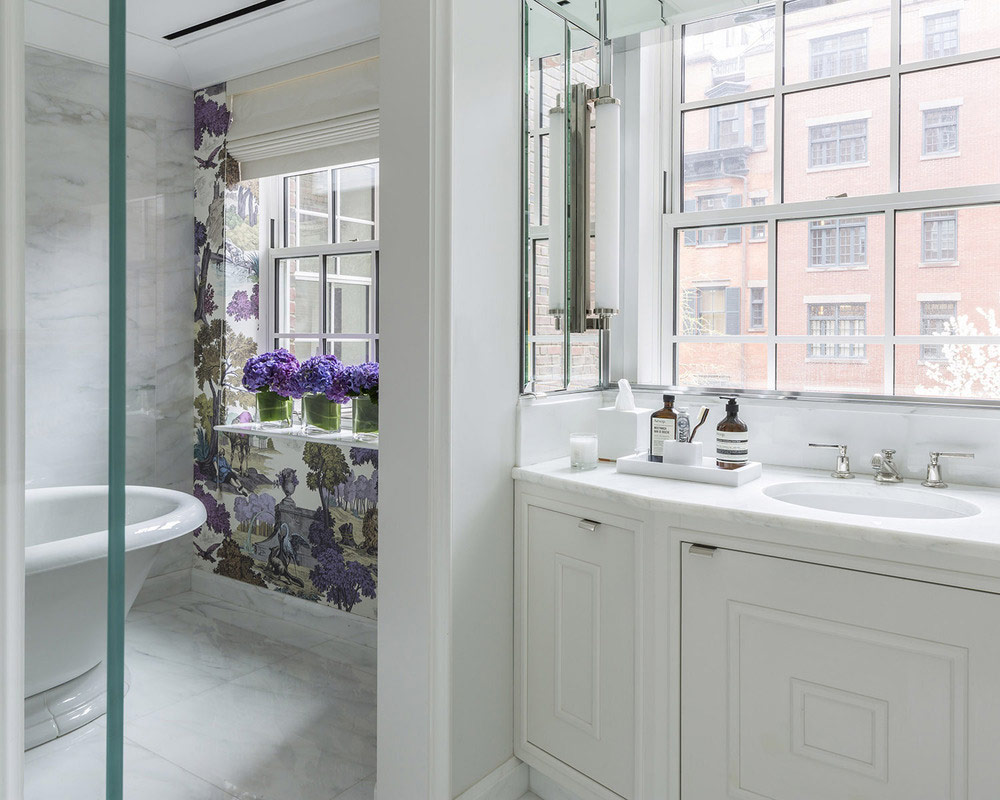 J'utilise du papier blanc dans les cuisines et les salles de bains, car il combine les tons de gris du marbre de Carrare et la blancheur absolue du lavabo et des toilettes". // Katie Ridder)
