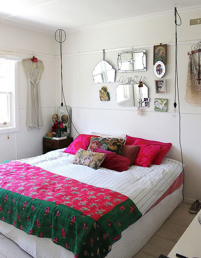 Des lustres, des coussins décoratifs lumineux et une literie colorée créent le style de cette chambre Douce william).