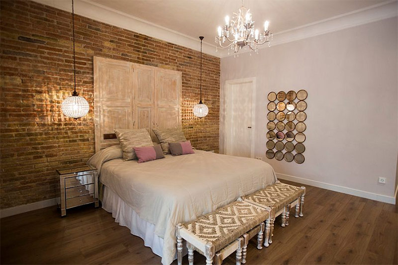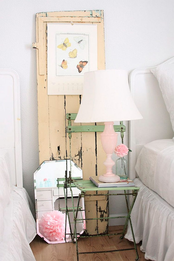 Une vieille chaise, une porte vintage et une belle lampe donnent le ton dans la zone du chevet Blancs rêveurs).