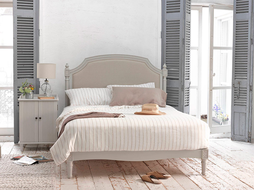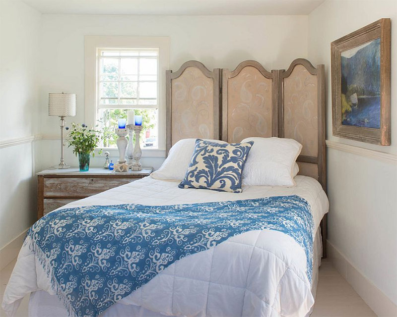 La tête de lit fait partie de ces éléments qui ont une grande influence sur le look de l'intérieur et définissent souvent le style du reste de la chambre à coucher. Les têtes de lit qui iraient harmonieusement dans une chambre décorée dans un style shabby chic peuvent être très diverses. Souvent, à ce titre, ils utilisent de vieux panneaux de bois, un volet roulant ou une porte de grange, qui, semble-t-il, ont déjà servi leur âge. Faire une telle tête de lit est assez facile si vous avez réussi à trouver une de ces vieilles portes. Il suffit d'enlever toutes les couches de peinture existantes et de les peindre en blanc - vous obtiendrez une tête de lit exquise qui correspond au style choisi.