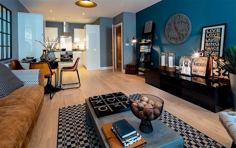 Ce salon de Suna Interior Design Studios est un mélange de fantaisie et d’attrait. Cet espace aux tons sombres et saturés et aux éléments de l'intérieur sélectionnés individuellement crée une ambiance. Le modèle de collection de Battersea Power Station et l’œuvre d’art moderne située à proximité, qui porte le nom de Wandsworth, indiquent que ce salon est situé dans l’une des maisons de Londres. Le voisinage de différentes textures, comme une table basse en béton, un canapé en cuir et un canapé en velours, crée un contraste net. Et la combinaison de couleurs bleue, marron, grise et noire s'intègre de manière surprenante et efficace dans l'atmosphère de l'espace urbain.
