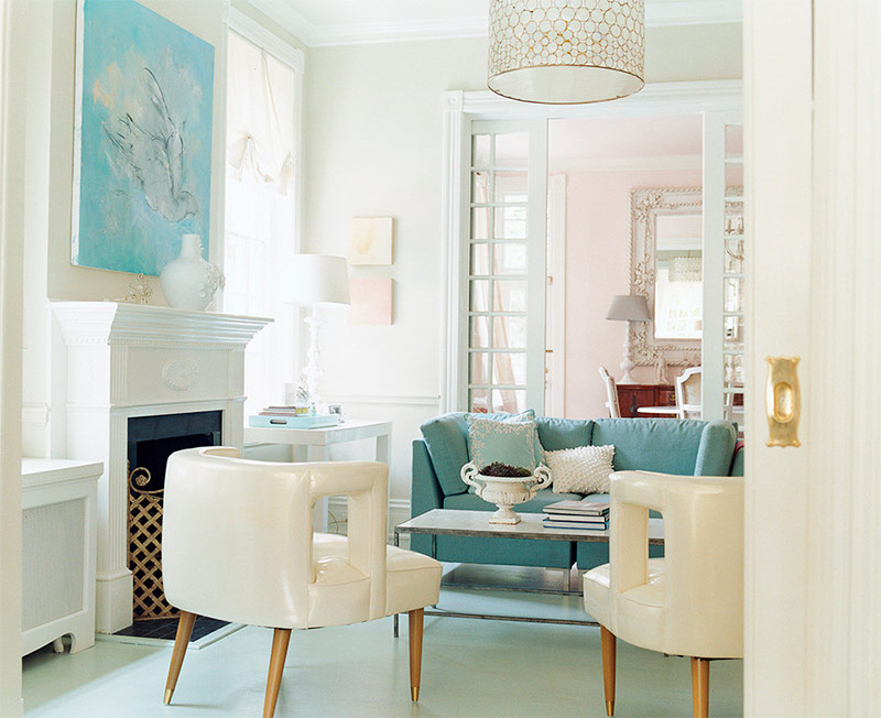 Je suis littéralement tombé amoureux de ce salon la première fois que je l'ai vu dans le magazine Domino en août 2008. Il appartient à la galeriste et entrepreneure Katie Ukrops de Richmond, en Virginie. J'ai toujours été attiré par les couleurs pastel, mais leur utilisation «à l'âge adulte» peut être assez difficile. Ici ça a réussi! Les teintes rose pâle et bleu tendre étaient mon tremplin et, à ce jour, je les utilise comme gabarit pour la décoration des intérieurs de salon.
