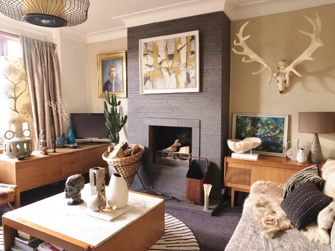 J'ai un goût éclectique. J'aime combiner des objets de maison et des meubles vintage et modernes dans un même intérieur. C’est pour cette raison que j’aime vraiment ce salon, dont les propriétaires ont combiné les caractéristiques en teck des années 60 et 70 avec des accessoires africains et une lampe dans laquelle on peut tracer une légère touche de style industriel. Je suis particulièrement ravi de l’image en trois dimensions sur le mur du buffet en teck, un seau incliné pour le charbon, un foyer en acier gris foncé et une lampe ouest-allemande avec un grand abat-jour. Les objets tridimensionnels accrochés aux murs et la disposition des peintures à différentes hauteurs ne sont pas moins intéressantes, tout cela donne du volume à l’espace. Sans aucun doute, les propriétaires de ce salon adhèrent à la règle que j'essaie de suivre: entourez-vous d'objets que vous aimez, parce que c'est votre maison!