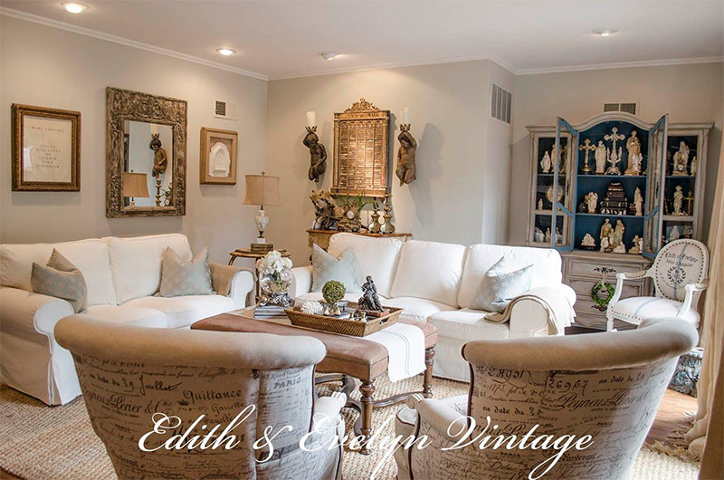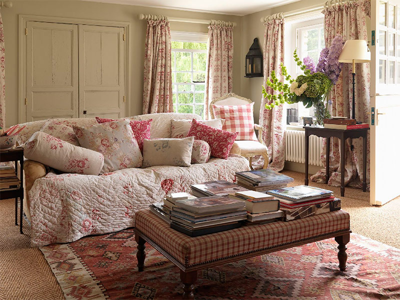 Je vous présente mon idée d'un salon très confortable et attrayant (image extraite du livre "Cabbage and Roses"). J'adore la façon dont la pièce est éclairée par les magnifiques fenêtres à battants situées de part et d'autre, et par les lourds rideaux de la longueur du sol qui encadrent la vue du jardin. Des murs de couleur neutre et chaude se marient parfaitement avec des tissus à fleurs et à carreaux délavés vintage qui créent une sensation de facilité et de confort. La cape du canapé confère non seulement un aspect encore plus confortable à la pièce, mais constitue également une excellente solution pratique pour les familles avec enfants en bas âge. L'empilement de livres et de magazines sur une table basse ou un repose-pieds est une excellente idée: ce «désordre créatif» renforce le sentiment de facilité.