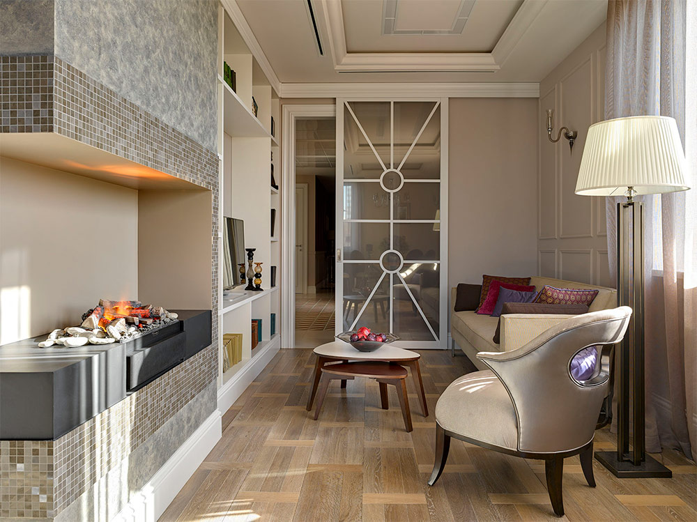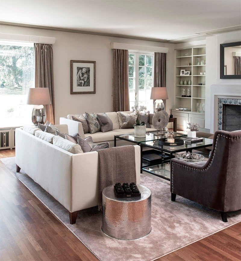 J'aime ce magnifique salon classique gris, marron et taupe. Cette palette de couleurs respire l'élégance. L'utilisation d'éléments métalliques argentés est une très bonne idée, car ils unissent tout l'intérieur et créent un sentiment de luxe, sans le submerger. La ligne est mince entre élégance et bouffie, et dans ce cas, l'équilibre parfait est atteint. J'imagine que je suis assis dans ce salon, dans un fauteuil, près de la cheminée, en train de lire mon livre préféré.