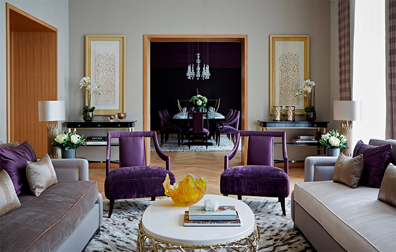 Le salon est généralement le cœur de la maison. Que vous l'utilisiez pour des réunions formelles ou pour la vie quotidienne, cela devrait refléter votre personnalité et votre style. Ce salon incroyablement élégant est l'incarnation de mon idéal. À première vue, la pièce a l'air très simple, mais une connaissance plus détaillée de cette pièce vous aidera à obtenir de nombreux conseils de décoration précieux qui peuvent être appliqués à n'importe quel espace. Tout d’abord, la pièce a de belles touches de lilas, contre lesquelles les accents dorés ont fière allure. Deuxièmement, les chaises en fourrure de Mongolie, douces et très attrayantes en apparence, servent d’éléments de mode qui ajoutent de la texture à l’intérieur. (À mon avis, il devrait y avoir un élément bizarre dans chaque espace de vie.) Les tapis apportent encore plus de texture dans cette pièce. Enfin, on peut observer une bonne combinaison d'éléments de différentes époques. Par exemple, un grand miroir antique ajoute une touche d'antiquité au mobilier moderne.