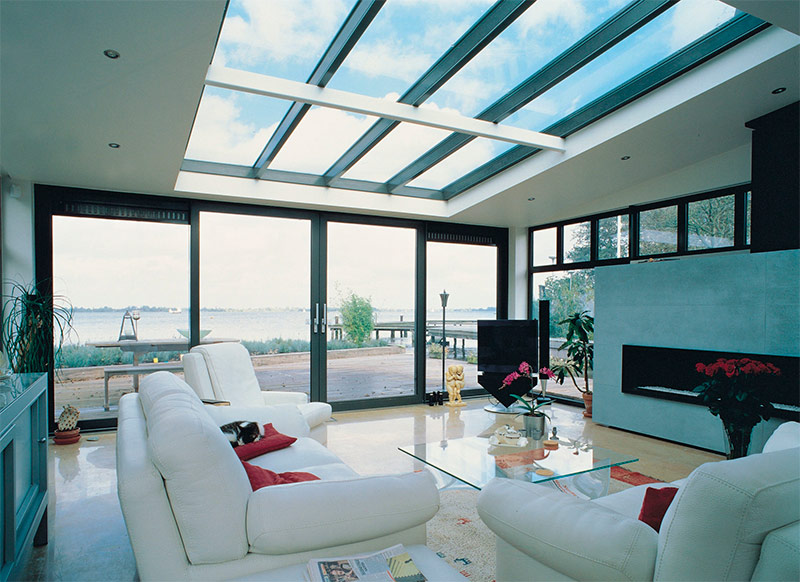 Ce salon semble tellement grand parce qu'il crée le sentiment d'être à la fois à l'intérieur et à l'extérieur. Vous pouvez profiter de la connexion avec la nature sans quitter le confortable salon. Il est facile d’atteindre cet effet - il s’agit des portes en verre d’Air. Grâce aux portes coulissantes populaires aujourd'hui, il a été possible non seulement de créer une sensation d'espace, mais également d'augmenter considérablement la quantité de lumière naturelle à l'intérieur de la pièce. La touche finale à l'intérieur de cette pièce était une table en verre, des étagères, un sol. Le design moderne est très populaire parmi les propriétaires de nos jours et les grandes portes vitrées constituent un moyen idéal pour ouvrir efficacement l’espace de votre maison.