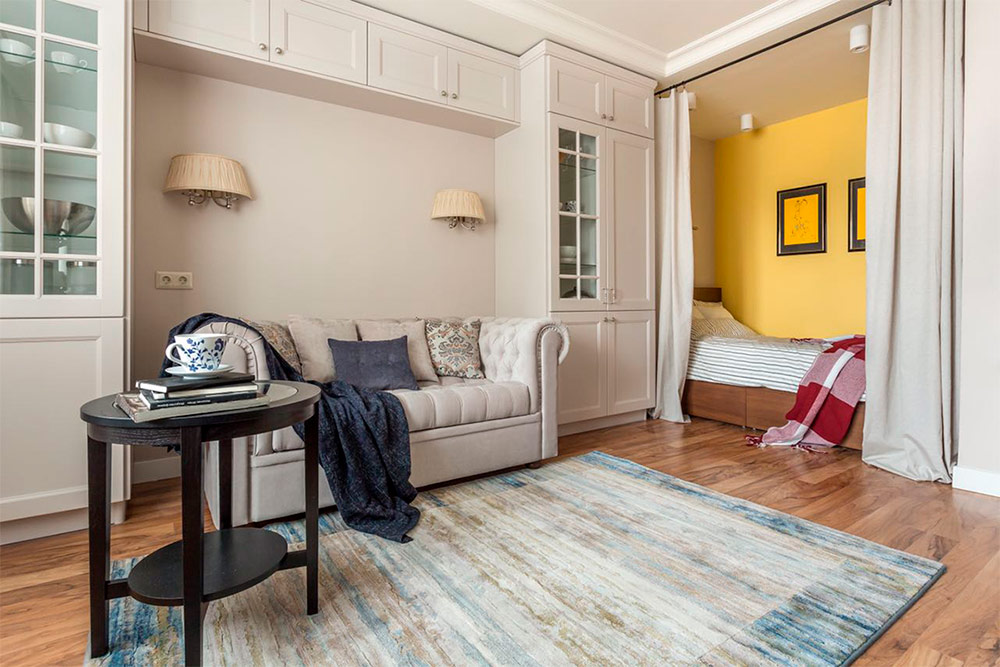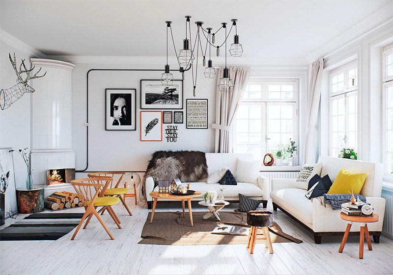 Pour moi, le salon est plus qu’un endroit confortable où vous pourrez vous détendre. C'est un espace multifonctionnel où le propriétaire de la maison peut, entre autres, montrer son goût, son style. Je pense que l’attribut le plus important du salon est un canapé confortable et des sièges supplémentaires pour les invités. Un grand tapis, des coussins décoratifs pour le canapé et un éclairage contribueront à décorer la pièce la plus ennuyeuse et triste. J'aime le mélange de textures, de fond blanc pur et d'accent jaune dans ce salon de style scandinave. La cheminée et les œuvres d'art sur le mur sont une belle addition.