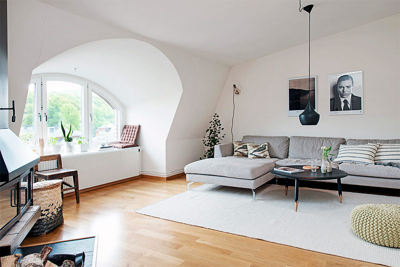 Ce salon avec une superbe cheminée et une lucarne incurvée, qui attire immédiatement l’attention, a été aménagé de manière à préserver la première impression enthousiaste. La couleur noire de la cheminée se reflète sur le mur opposé dans la suspension basse et la table basse Hoof. La moquette et le canapé dans des tons neutres se marient bien avec d'autres éléments intérieurs. Le pouf vert et les plantes d'intérieur reflètent le vert des arbres à l'extérieur de la fenêtre. Tout cela crée un intérêt supplémentaire pour l'espace. L'intérieur dans son ensemble est léger, naturel et minimaliste. Pour atteindre le parfait équilibre de beauté et de fonctionnalité que je recherche chez moi, rien de plus n'est nécessaire.