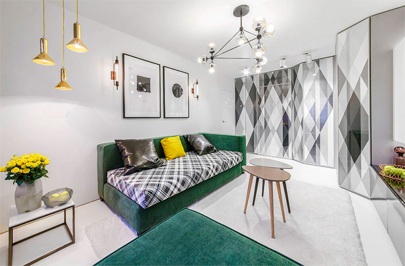 J'aime la couleur, il n'est donc pas surprenant que j'aime vraiment l'intérieur de ce salon dans une maison privée. L'abondance de lumière naturelle fait de cet espace une toile propre idéale pour une décoration plus poussée. Les accessoires jaunes donnent au salon un look très féminin. La pièce a l'air luxueuse, mais en même temps, elle est comme à la maison. J'aime le mélange de textures: tapis, toile au mur, surfaces brillantes, ainsi que le lustre du métal - tout cela ajoute à l'intérieur de la modernité.