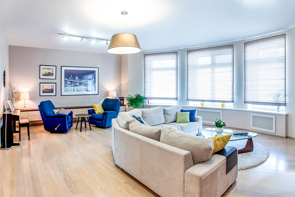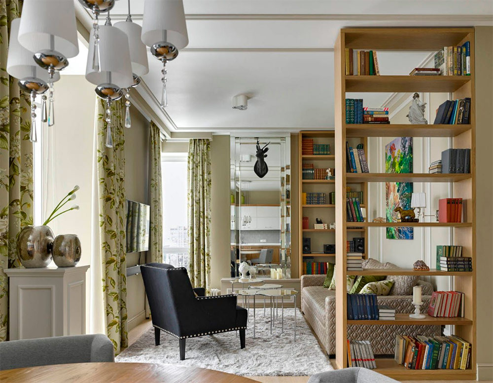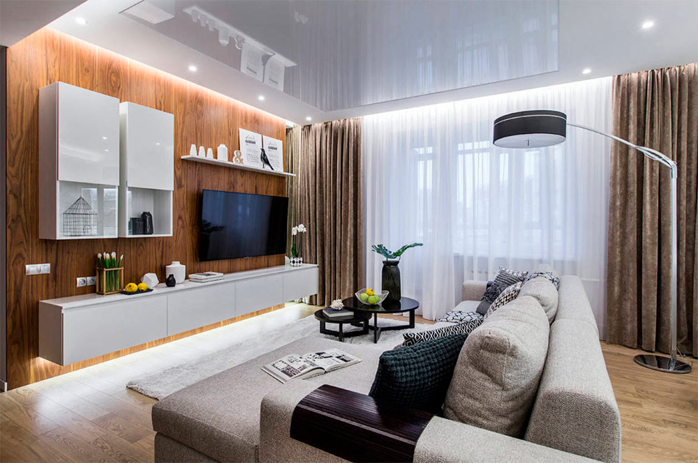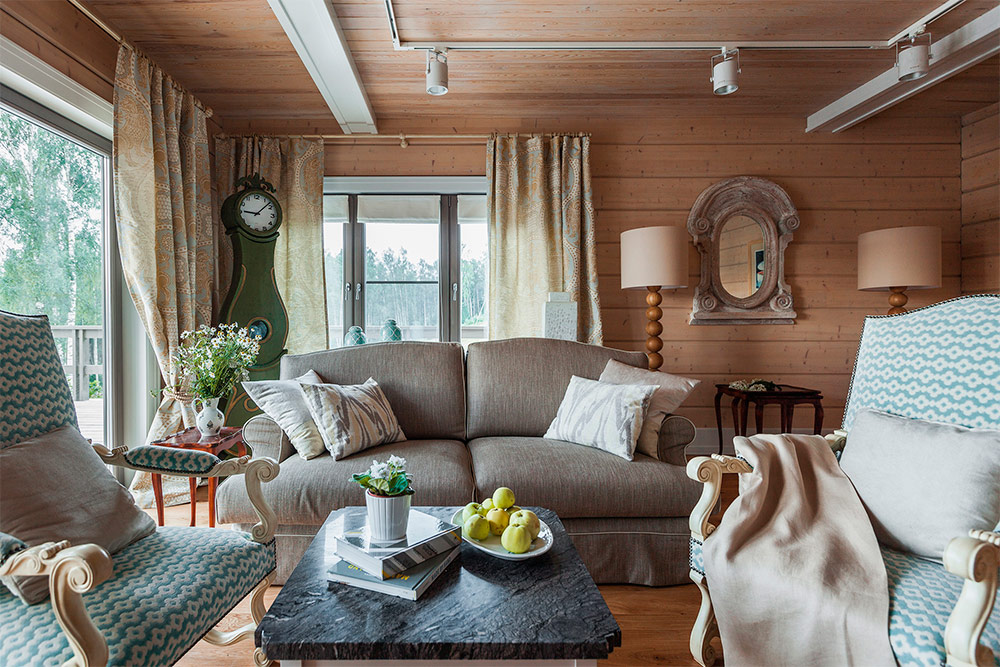 Souvent, la clé de la conception réussie d’un espace de vie consiste à sélectionner soigneusement une palette de couleurs. Ce magnifique salon utilise plusieurs nuances de base, mais des couleurs et des textures supplémentaires sont ensuite «injectées». Une autre façon de rendre la pièce plus intéressante et unique consiste à mélanger des matériaux anciens et nouveaux, ainsi qu'à utiliser des dessins clairs aux contours bien dessinés. Générer de nouvelles idées de design en s'éloignant d'un meuble ou d'une œuvre d'art vous permet de trouver votre inspiration et de maintenir en même temps le fil conducteur de l'idée originale.