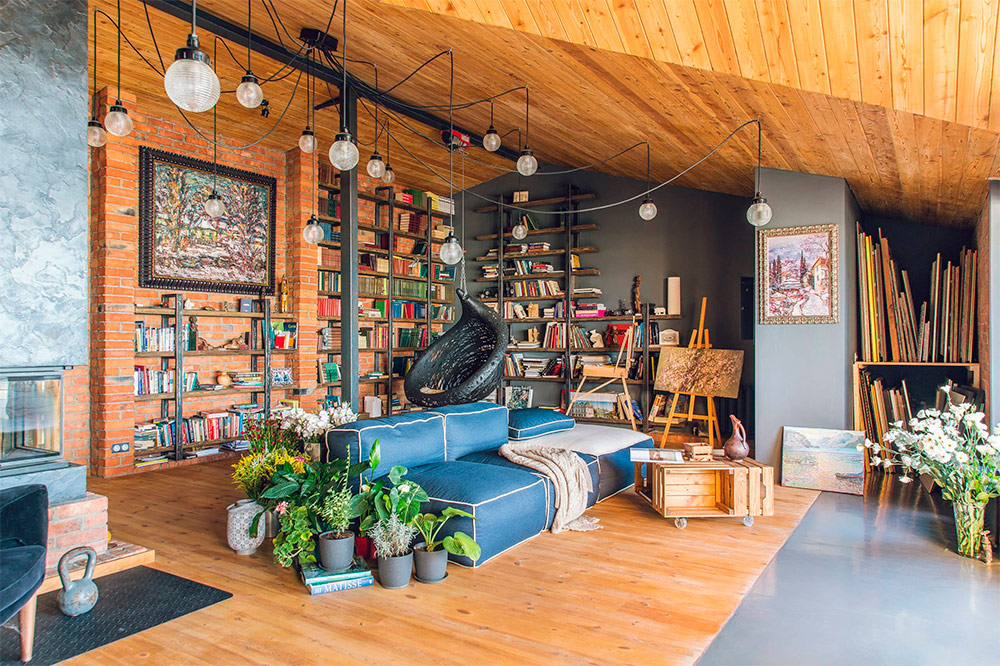 J'adore les salons remplis de livres, ils apportent des couleurs et des textures étonnantes, et vous pouvez les réorganiser lorsque vous souhaitez changer. Le véritable point fort de cet intérieur sont les plantes et les objets d'artisanat fabriqués à partir de matériaux naturels. Oubliez les rideaux - les plantes d'intérieur à feuilles caduques placées sur les rebords de fenêtres ou tout près des fenêtres imiteront les arbres à l'extérieur et cacheront les habitants de la maison des regards indiscrets.