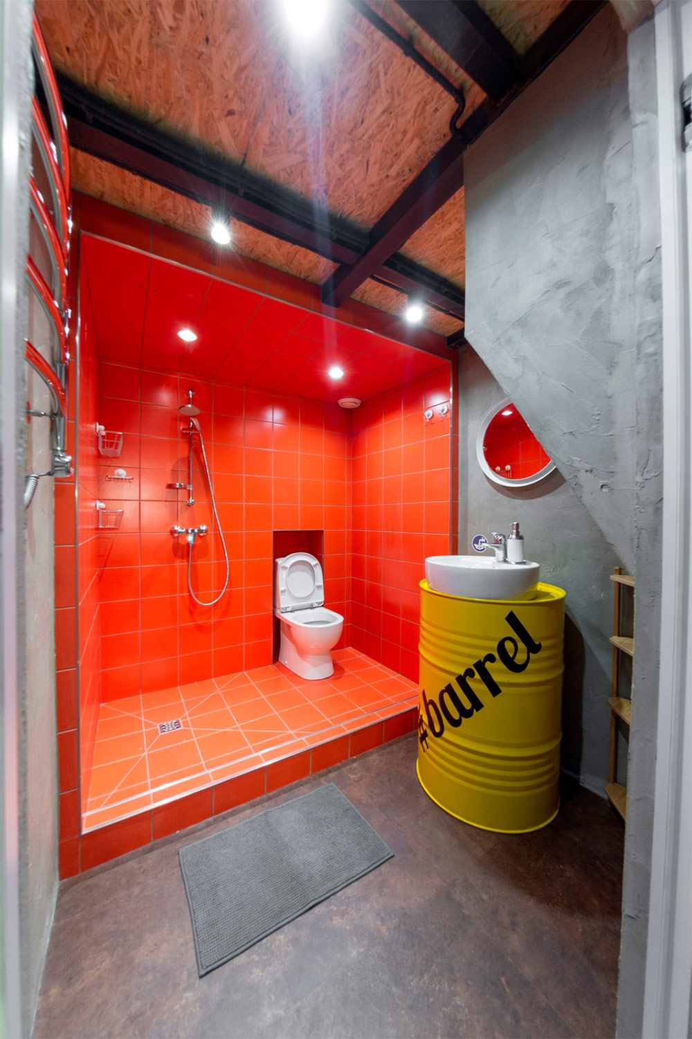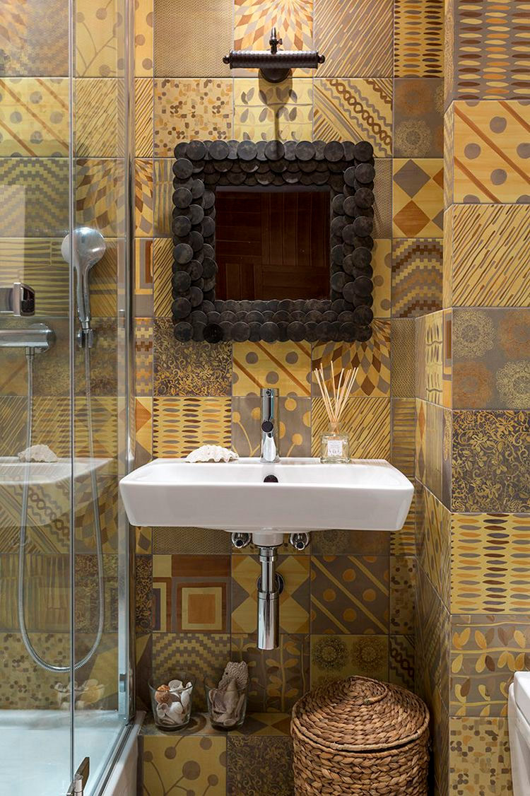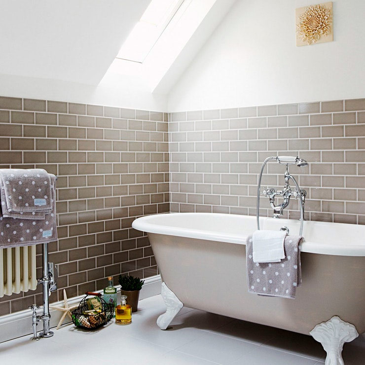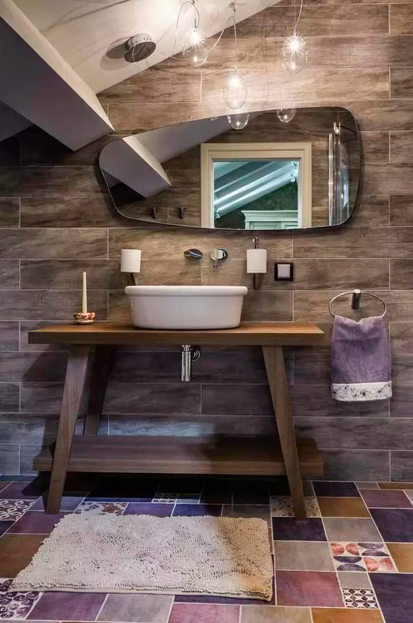Vous ne savez pas comment carreler les murs en pente du grenier? Ensuite, essayez de les réinitialiser jusqu’à la moitié de la hauteur. Cette approche permettra, d’une part, d’économiser sur les carreaux et, d’autre part, d’agrandir visuellement l’espace. Il est préférable de choisir un carrelage sombre et de peindre le plafond au-dessus en blanc.