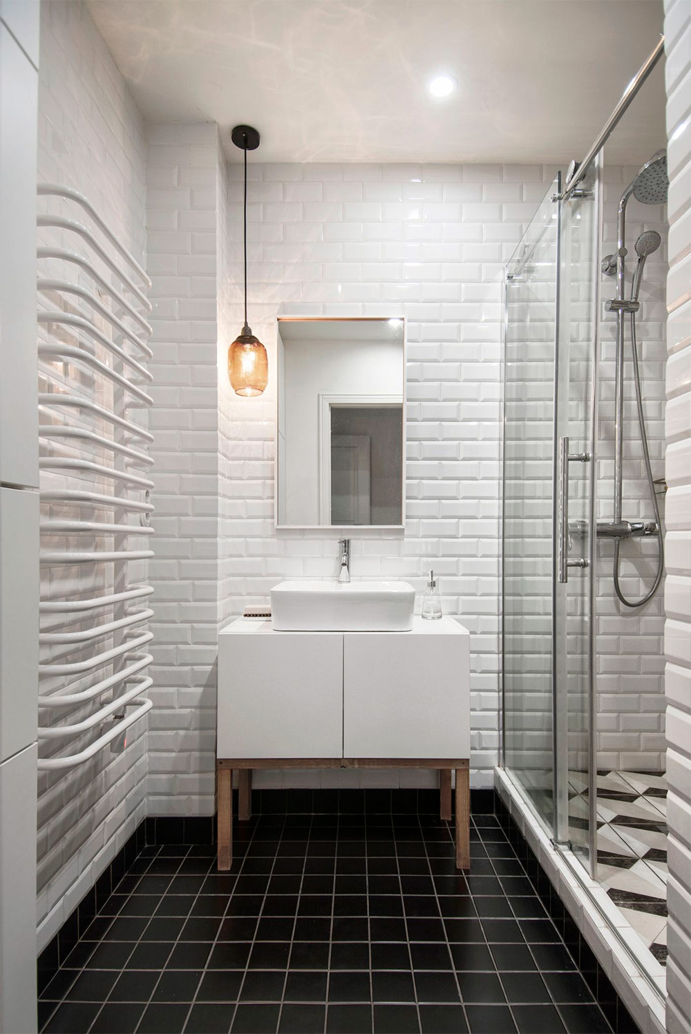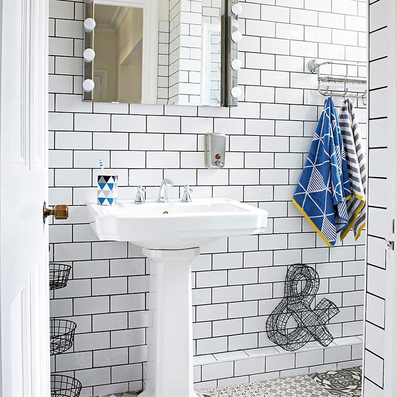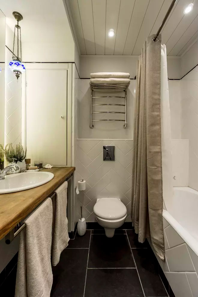 Vous serez surpris de voir à quel point la petite pièce vous semblera spacieuse si vous vous en tenez au schéma blanc lors de la décoration. Et la couleur, la texture et le motif peuvent toujours être ajoutés avec des accessoires. Une combinaison gagnante de carreaux blancs et de coulis noir est une combinaison gagnante dans la conception d’une petite salle de bains.