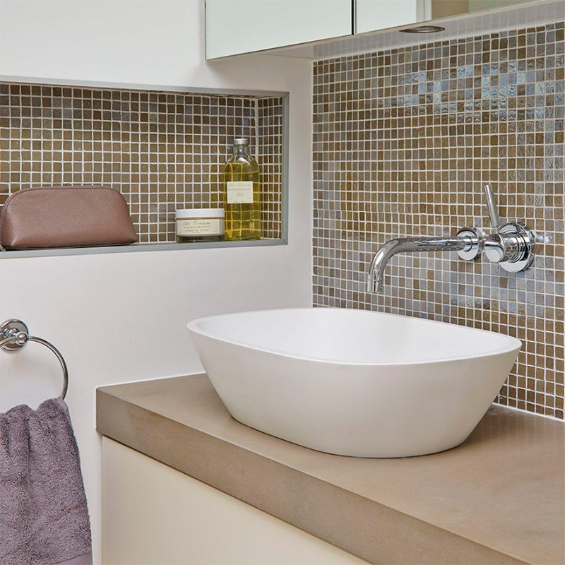 Les étagères "encastrées" dans le mur sont un excellent moyen d'économiser de l'espace, tant sur le plan visuel que visuel, et même de garder les articles de toilette dans un ordre ordonné et faciles d'accès. Pour vraiment gagner de la place, vous devez faire de telles étagères dans les faux murs qui cachent les tuyaux. Pensez également à installer des luminaires encastrés dans ces faux murs - ponctuels ou linéaires.